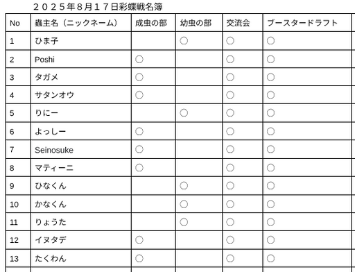 8月12日時点のエントリー数は、成虫の部16名(残0)、幼虫の部12名(残0)、交流会28名、とびだすの部(ブースタードラフト)20名(残0)です。