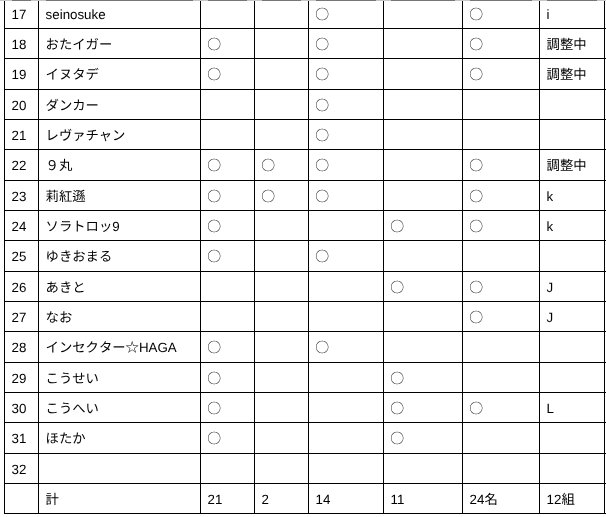 交流会21名(内、体験会2名)、成虫の部14名(残0)、幼虫の部11名(残3)、親子の部12組予定
