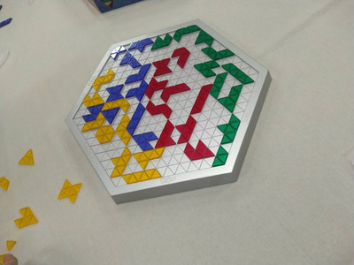 三角形がつながったタイルの角と角をつなげていき、ボード上により多くのタイルを置くゲームです。